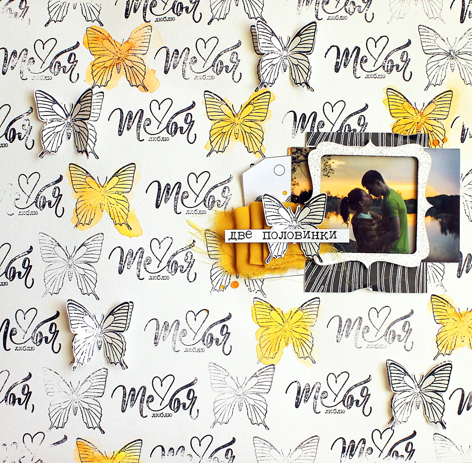 Материалы: лист "Золотая любовь" из коллекции "Пиономания", штампы "Мегаполис", "Мой номер один", "PRO чувства", краски-спреи, акварельная бумага.